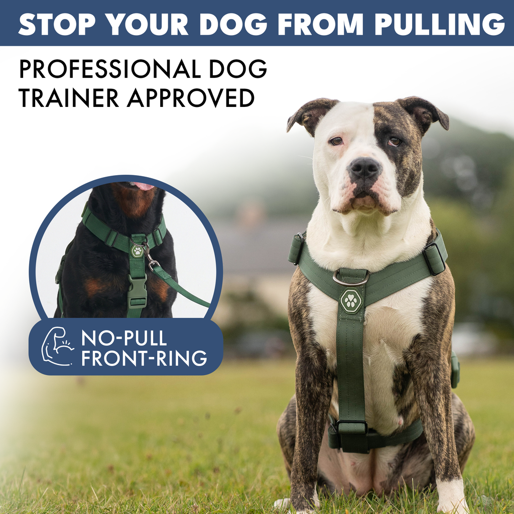 A: Our no-pull dog harness is designed to discourage your dog from pulling on the leash during walks. The front D ring works by redirecting your dog's pulling force to the sides or front of the harness, rather than allowing them to pull forward. You can also use the Back D ring for everyday walking or the Rear D ring for restraing free running.