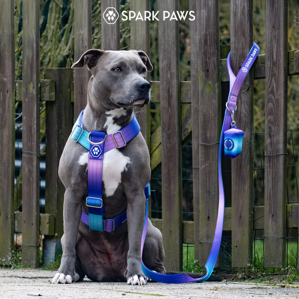 Ogni set include un >Harness anti-trazione per cani, un Guinzaglio in neoprene abbinato e un Porta sacchetti per i bisogni.