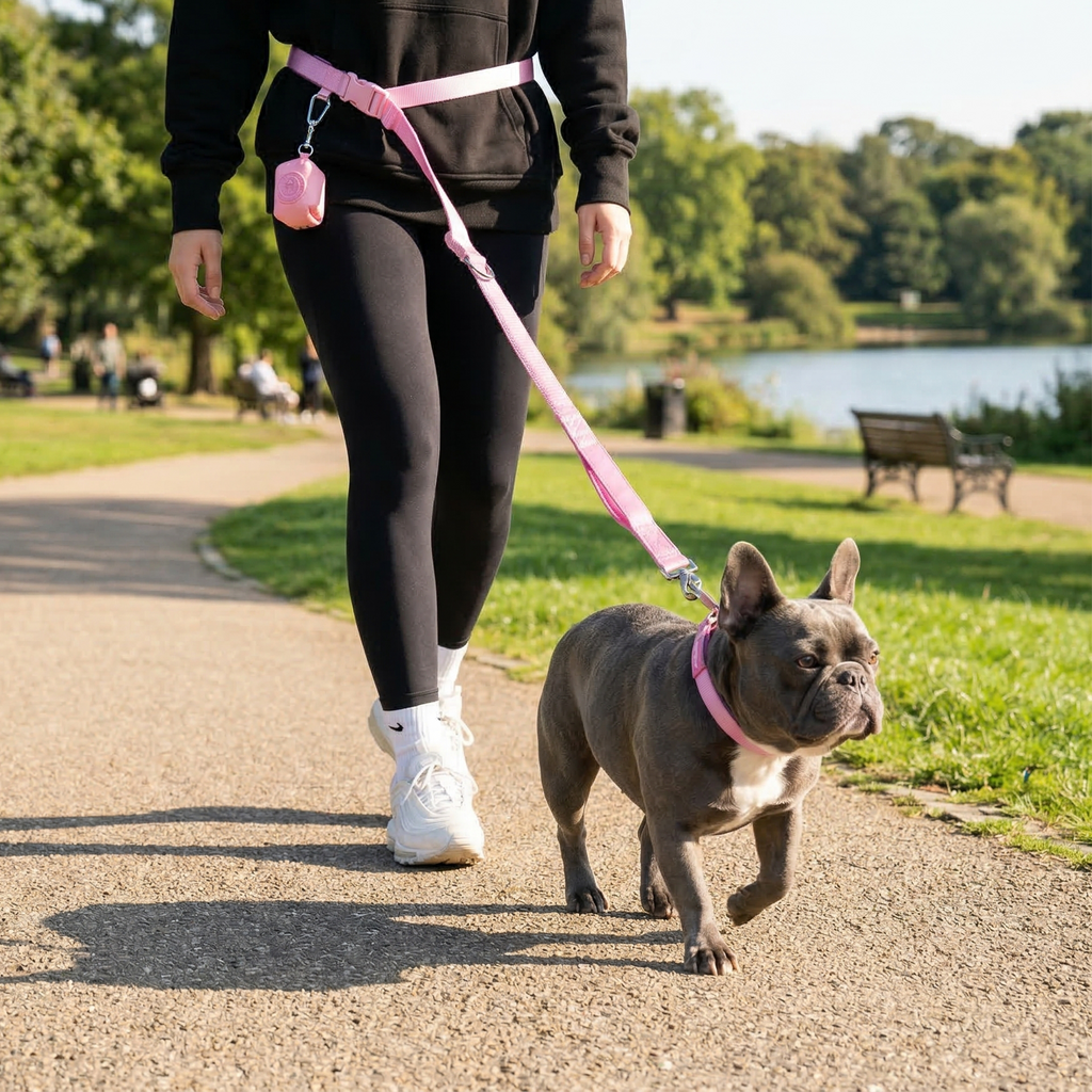 Mani libere o in mano: Cintura regolabile per jogging o commissioni; sgancio rapido per l'uso come guinzaglio standard.