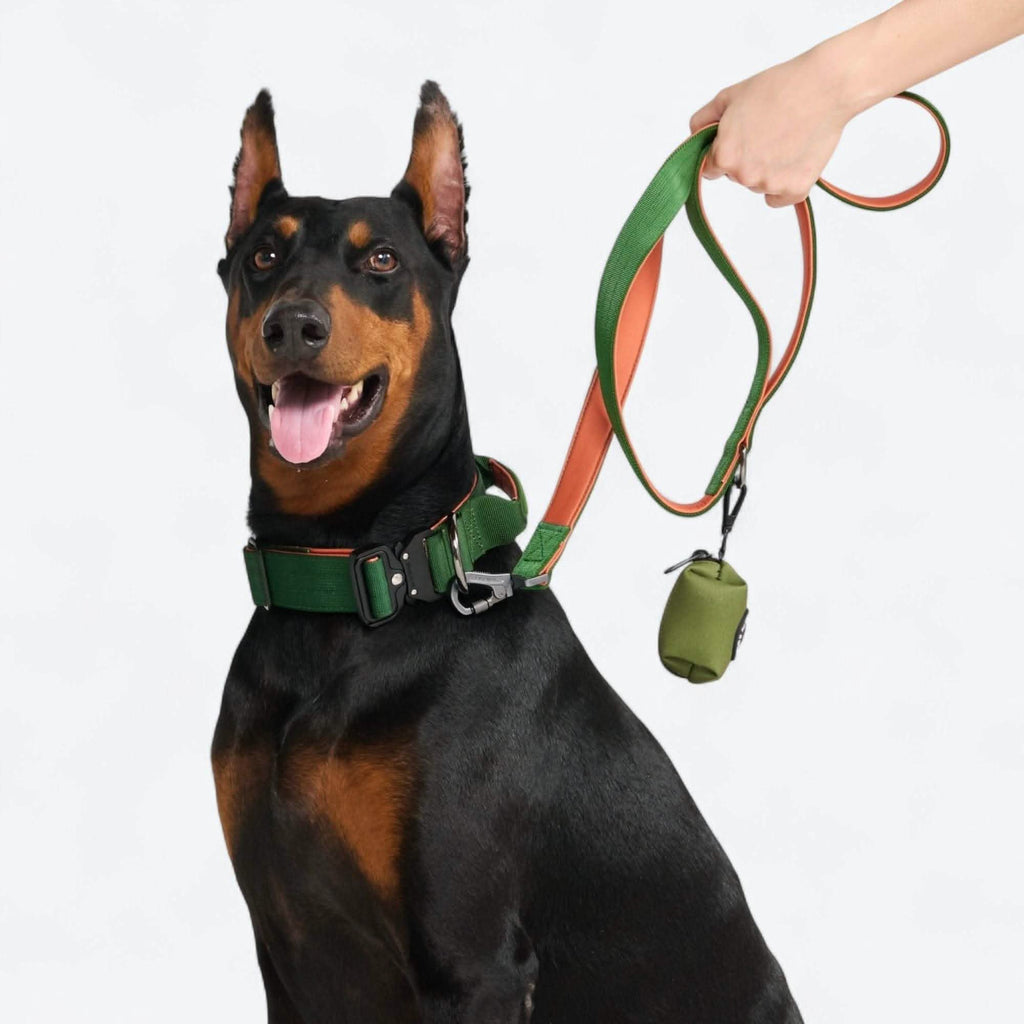 Ogni set include un Collare tattico per cani, un Guinzaglio in neoprene per cani e un Porta sacchetti per i bisogni.